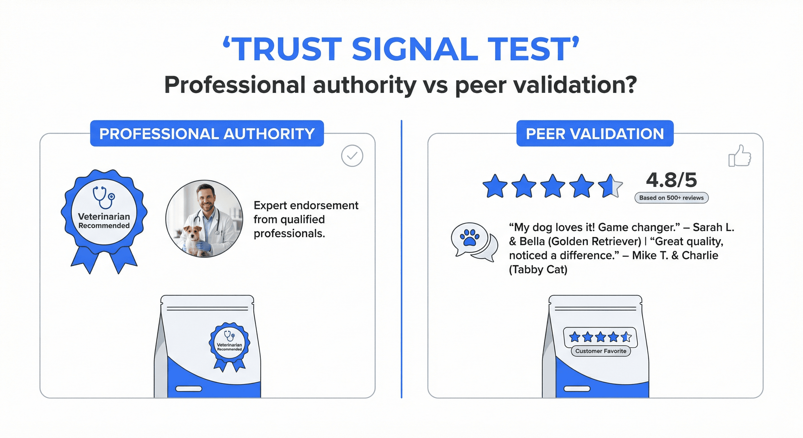 What you might explore: Veterinarian recommendation badge prominent vs customer testimonials prominent vs both equally weighted