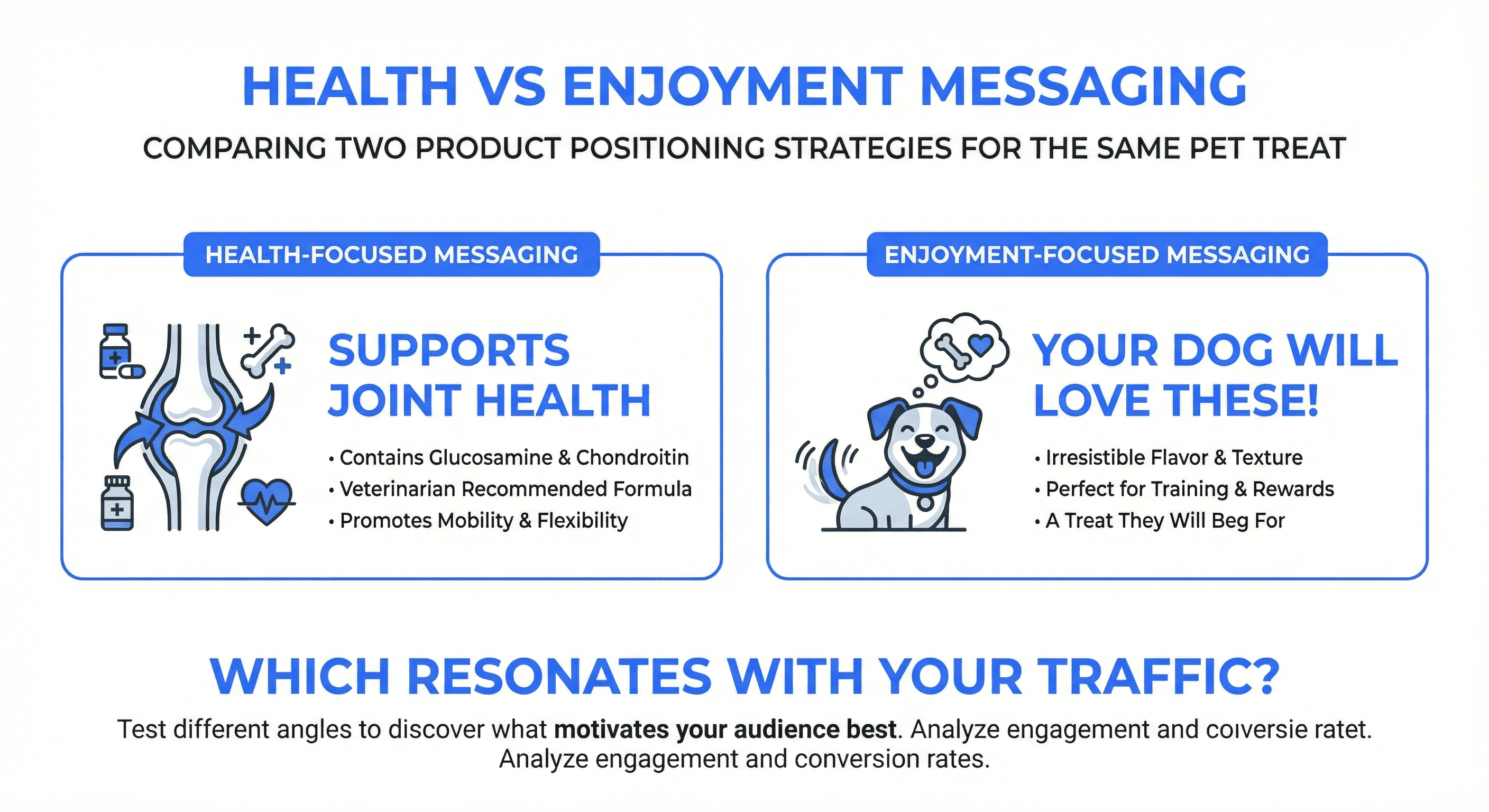 This pattern often points to a trust question that content testing can answer. Two types of proof compete for credibility: professional authority (vet recommended) and peer validation (customer reviews). Both have power in different contexts. Which matters more for your specific products and customers is something your data can help you explore.
