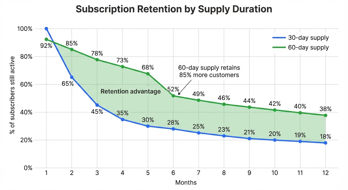 Hypothesis: Your supply sizing might be misaligned with actual consumption patterns. A 30-day supply might feel like too much commitment upfront. A 60-day supply might reduce the friction of frequent reordering but increase the barrier to first purchase.