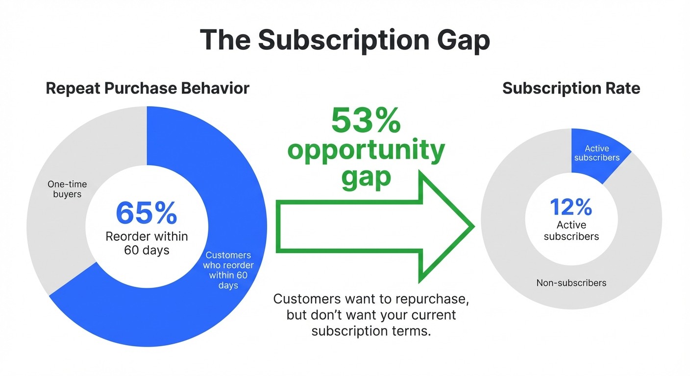 Signal: You're seeing customers manually reorder every 30 to 60 days, but your subscription conversion rate remains stubbornly low. They clearly want the product regularly. They just don't want to commit to your subscription terms.