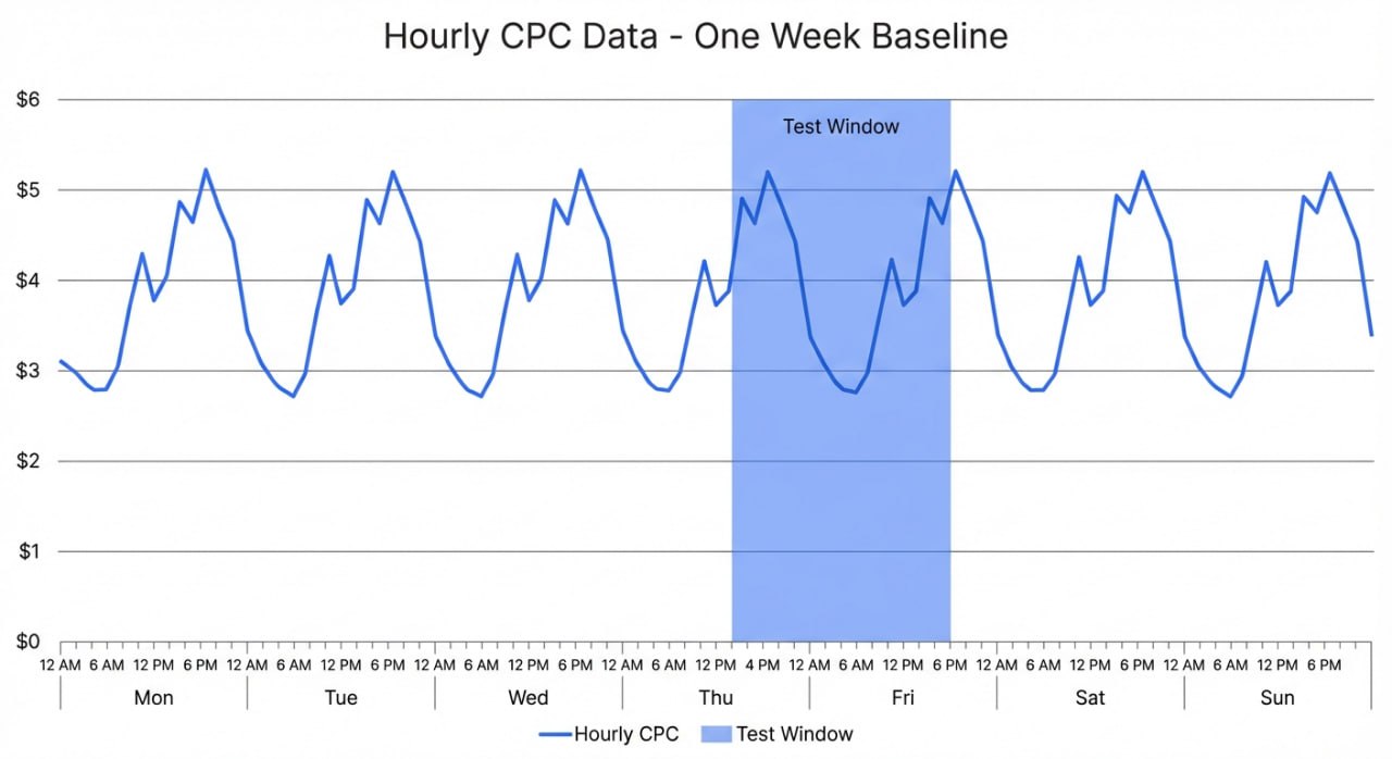 Pull your hourly CPC data for the week or two before your test. Look for patterns. Are there certain hours where you consistently see higher costs? Days that run hotter than others?