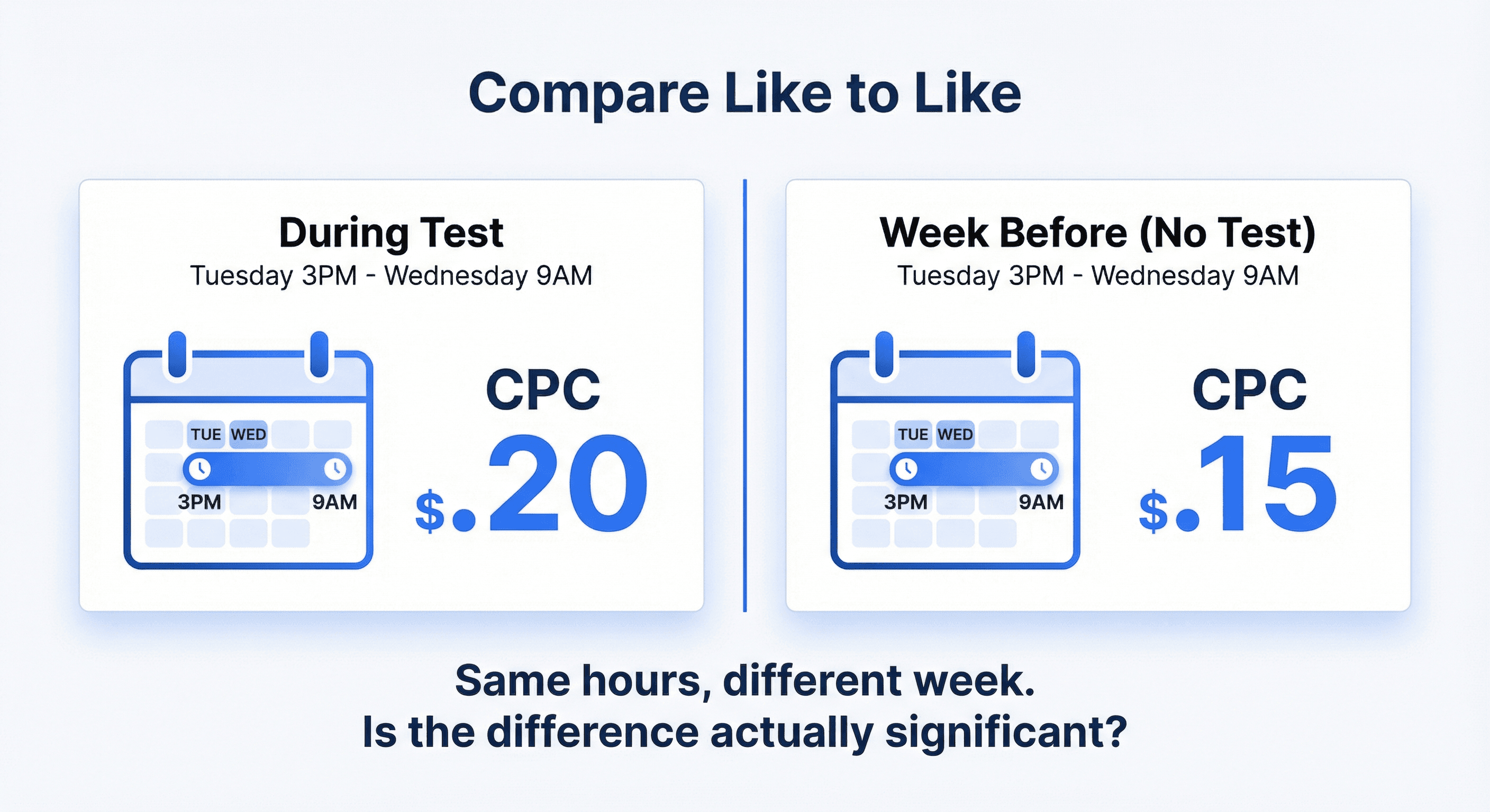 One merchant we worked with was convinced their test caused a CPC spike. When we pulled their historical data, we found their CPCs followed a consistent pattern that had nothing to do with the test. The "spike" they saw during the test matched what their account had been doing all along during those same hours.