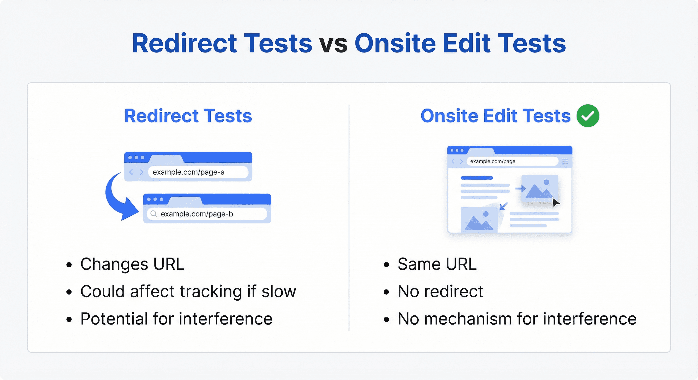 Onsite edit tests change elements on your existing pages without changing the URL. There's no redirect, no URL change, nothing that would signal to Meta that anything is different. The mechanism for interference just isn't there.