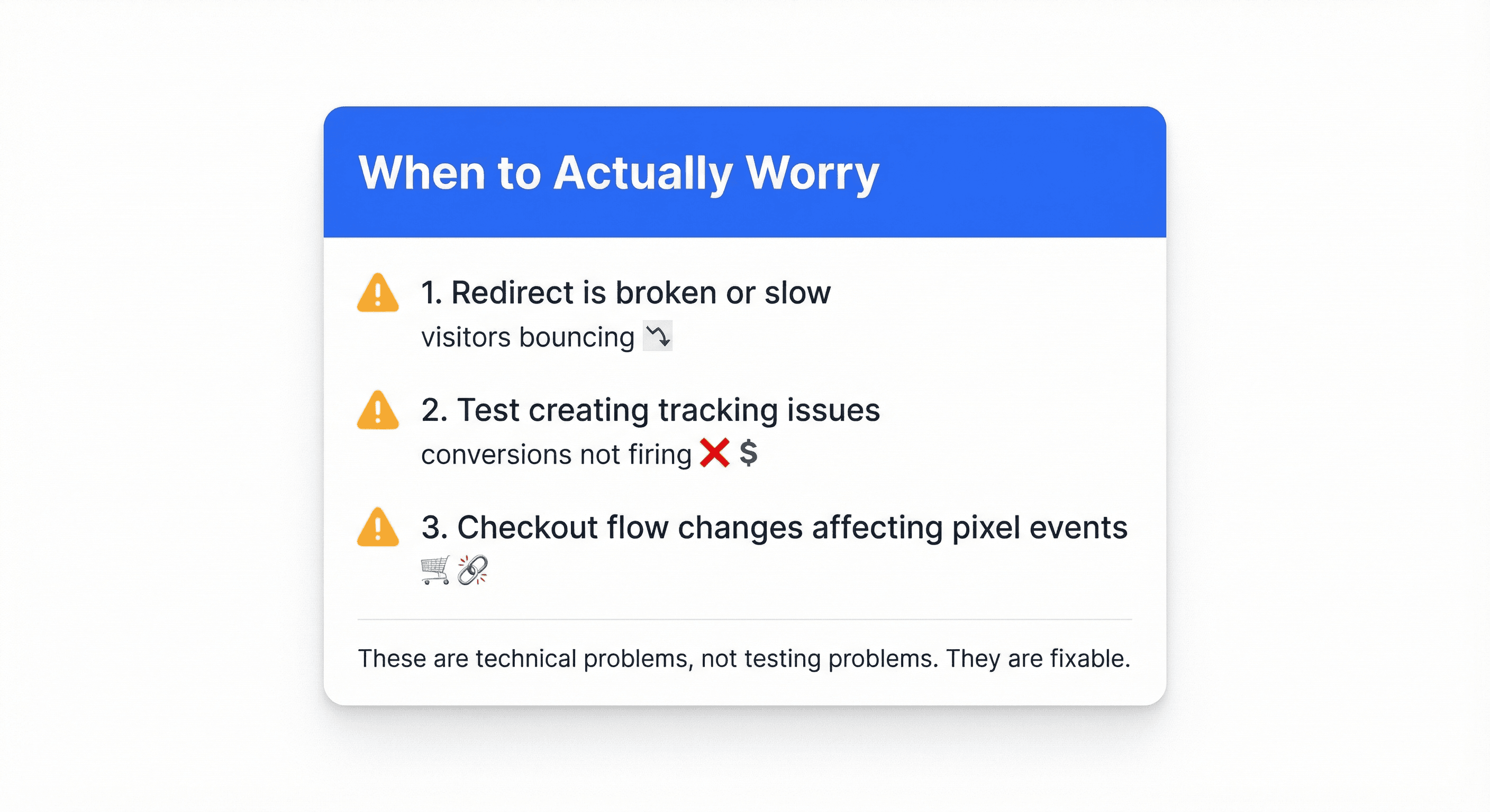 Redirect tests send visitors to entirely different URLs. In theory, these could affect Meta's conversion tracking if something goes wrong with the redirect. A slow redirect might look like a bounce to Meta, which could hurt your quality scores.