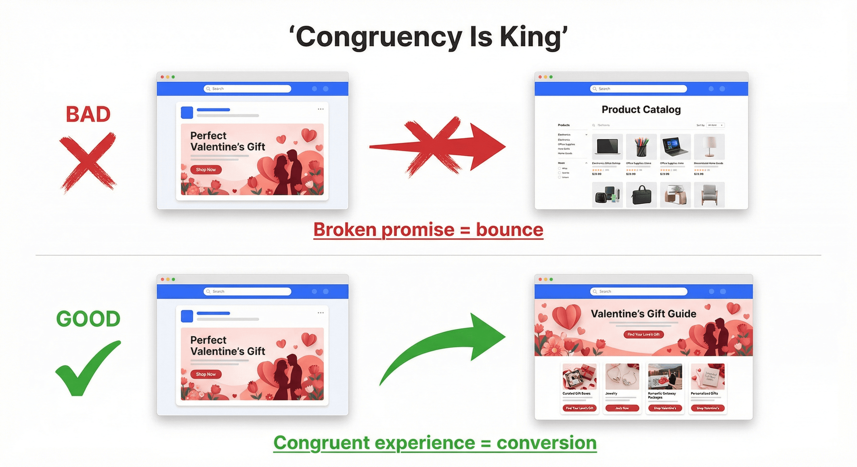 Congruency is king. If your ad says "Perfect Valentine's gift" and your landing page looks like any other Tuesday, you've broken the promise.