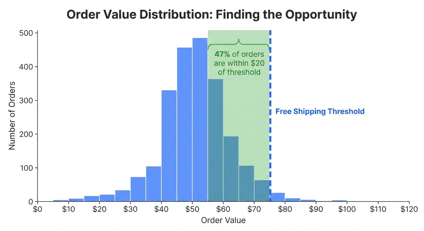 If your data shows order clustering below a threshold, test adjusting your free shipping threshold to different levels. Measure not just whether AOV increases, but whether the incremental revenue exceeds the incremental shipping cost. A threshold that lifts AOV by $15 but costs you $18 in additional shipping subsidies is a losing proposition disguised as a win.