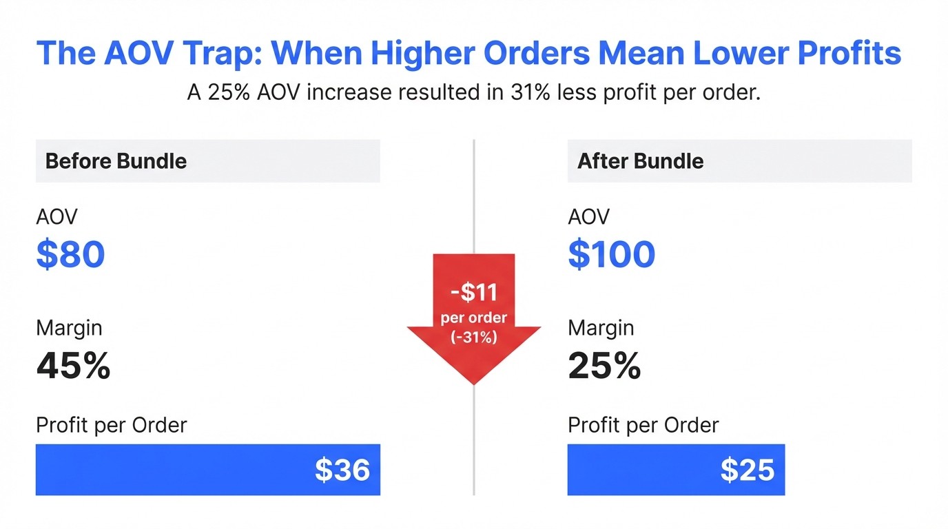 Average order value is one input to profit, not the destination. Consider this scenario: you create a bundle that increases your AOV by $20. Customers love it. Your dashboard looks great. But the bundle required a 25% discount to move, and after accounting for the additional fulfillment complexity and reduced margin on each item, you're actually making $5 less per order than before.