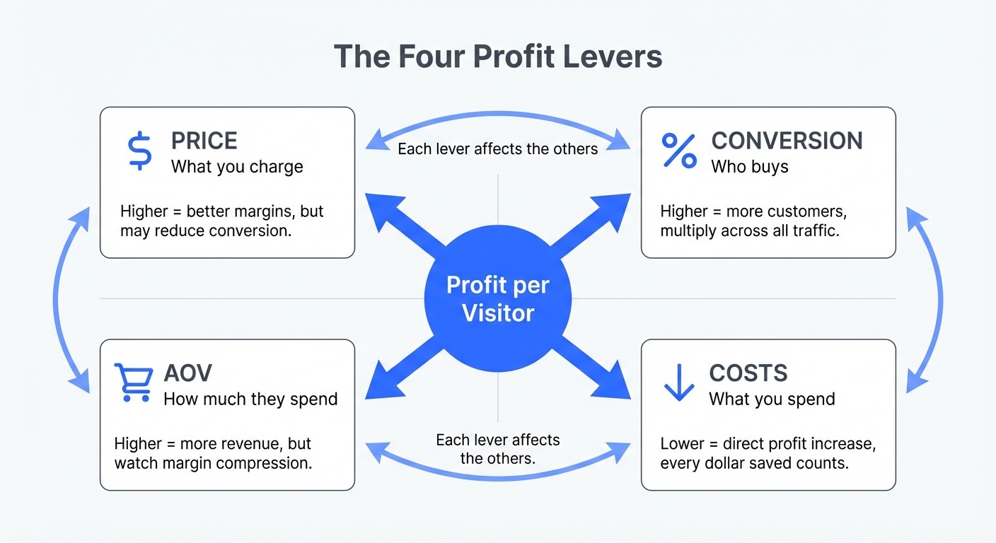 You have four levers: price, conversion, AOV, and costs. Your data tells you which one has room to move. Testing tells you whether moving it actually increases profit per visitor.