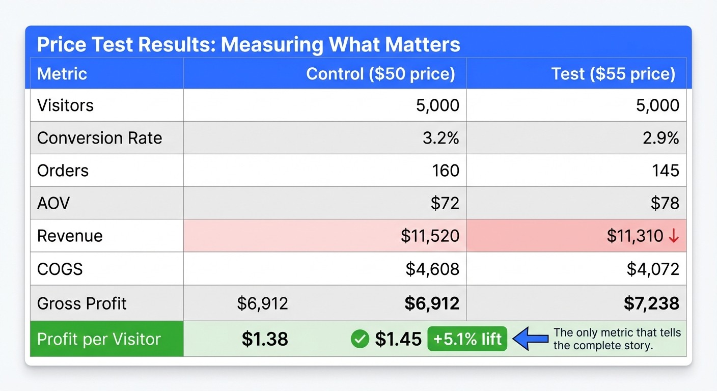 Measure profit per visitor as your North Star. Conversion rate, revenue per visitor, and AOV all matter as supporting indicators. But only profit per visitor tells you whether you're actually winning.