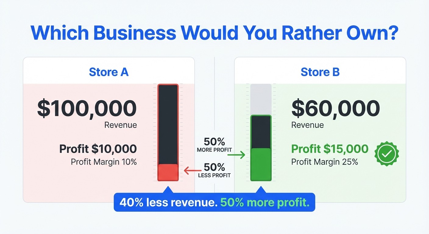 But growing revenue while shrinking profit is a losing game. You can watch your top-line number climb while your bank account tells a different story. Revenue is what you collect. Profit is what you keep. The gap between those two numbers determines whether your store survives.