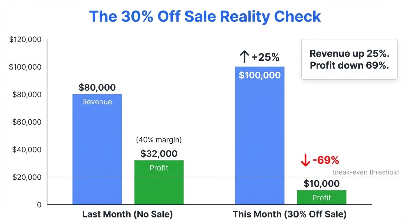 Picture this scenario: You run a 30% off sitewide sale. Orders flood in. Revenue jumps 25% compared to last month. Success, right?
