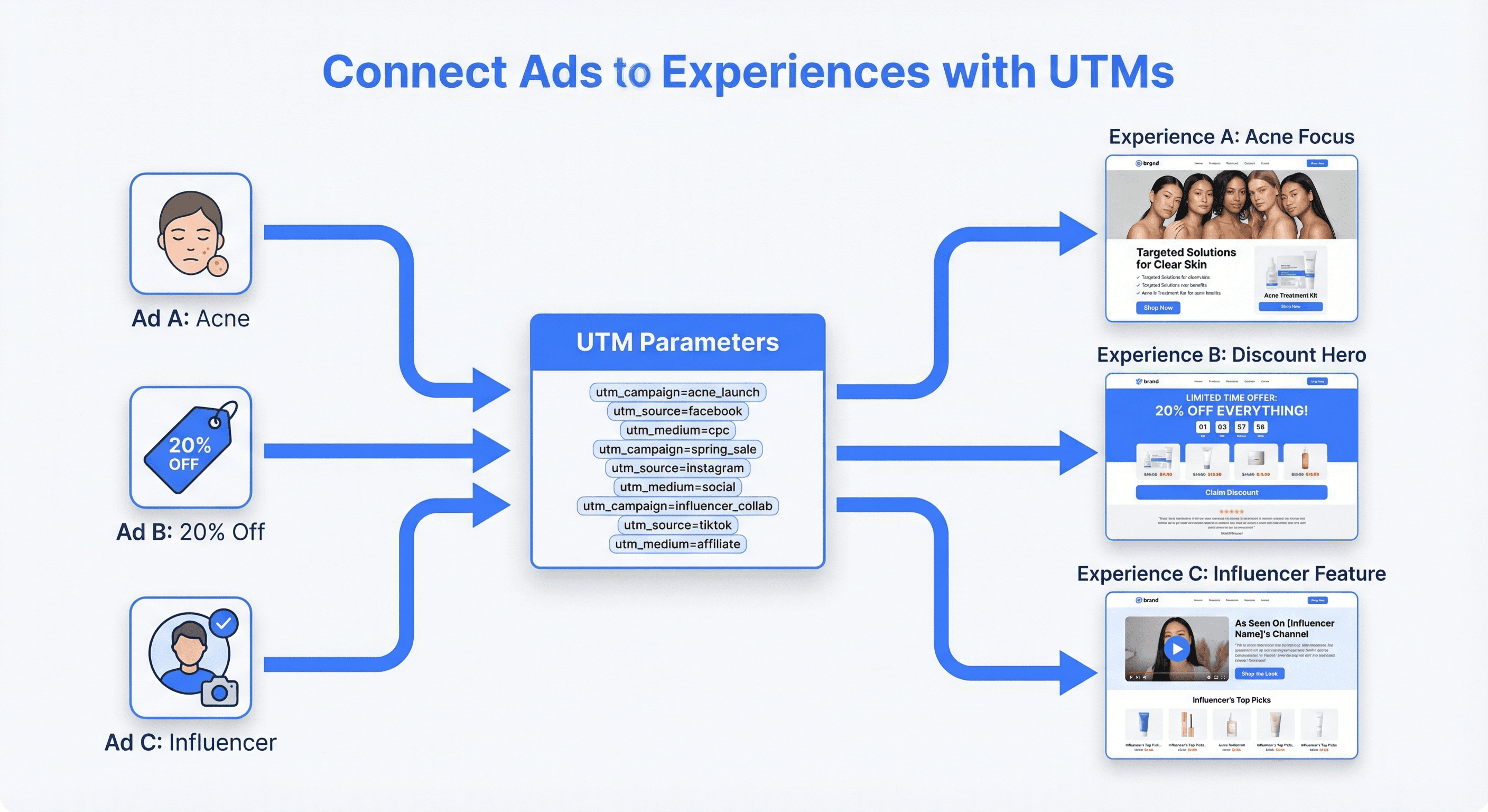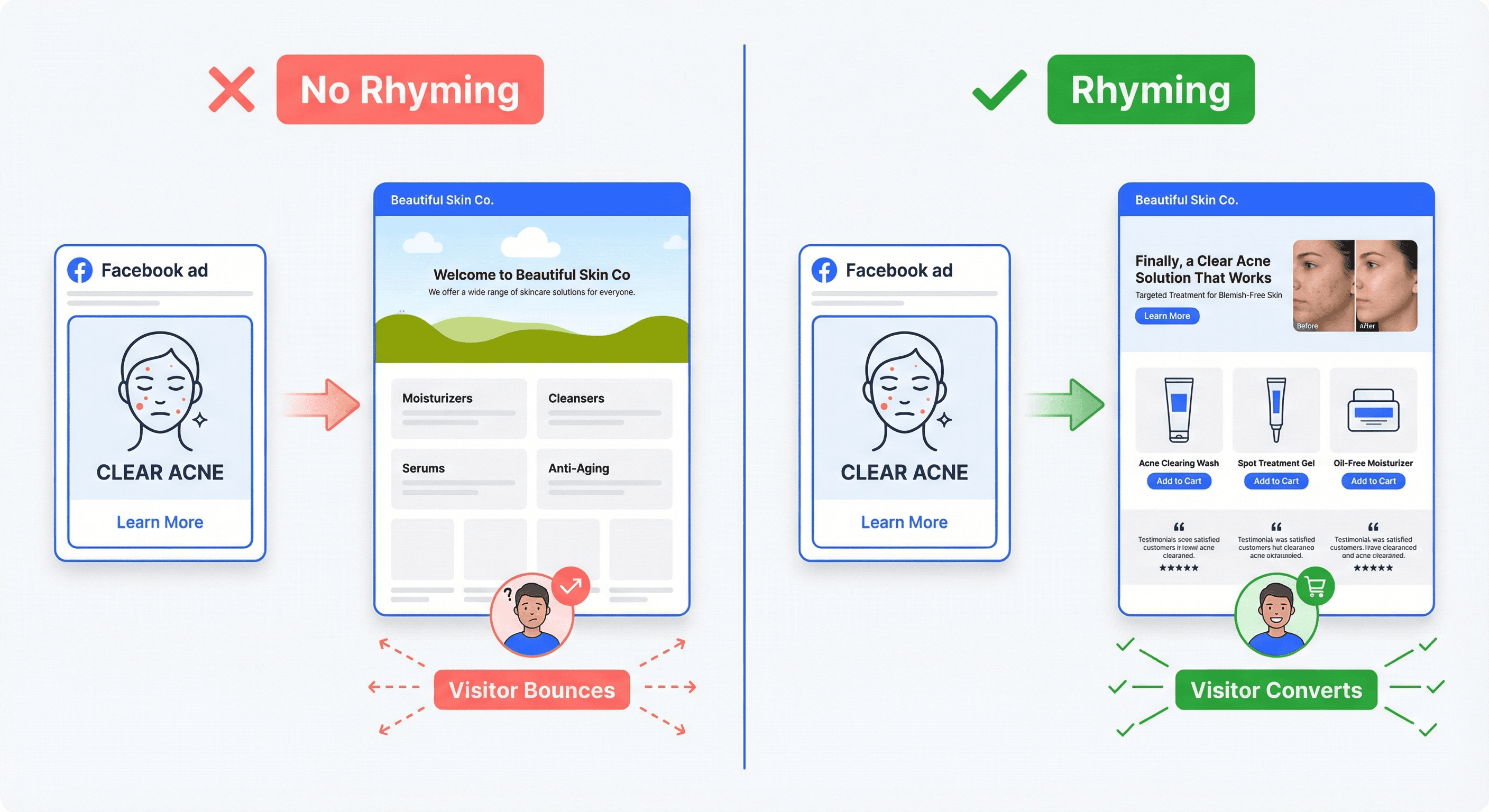 Someone clicks your ad about clearing acne. They land on your homepage. Generic hero. "Welcome to Beautiful Skin Co."