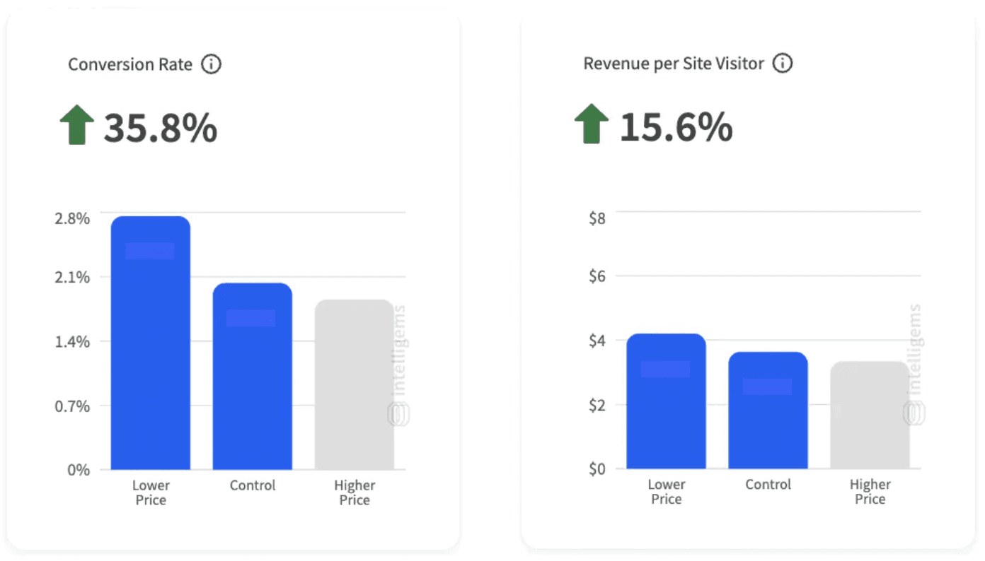Both higher and lower prices performed better than the control, but reducing prices opened the door for both revenue growth, but also improved conversion