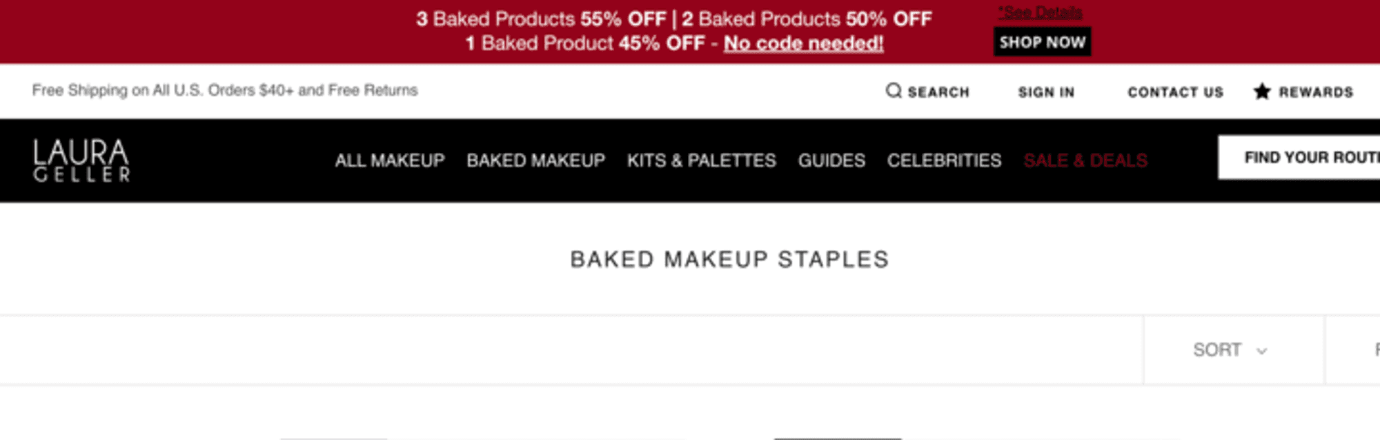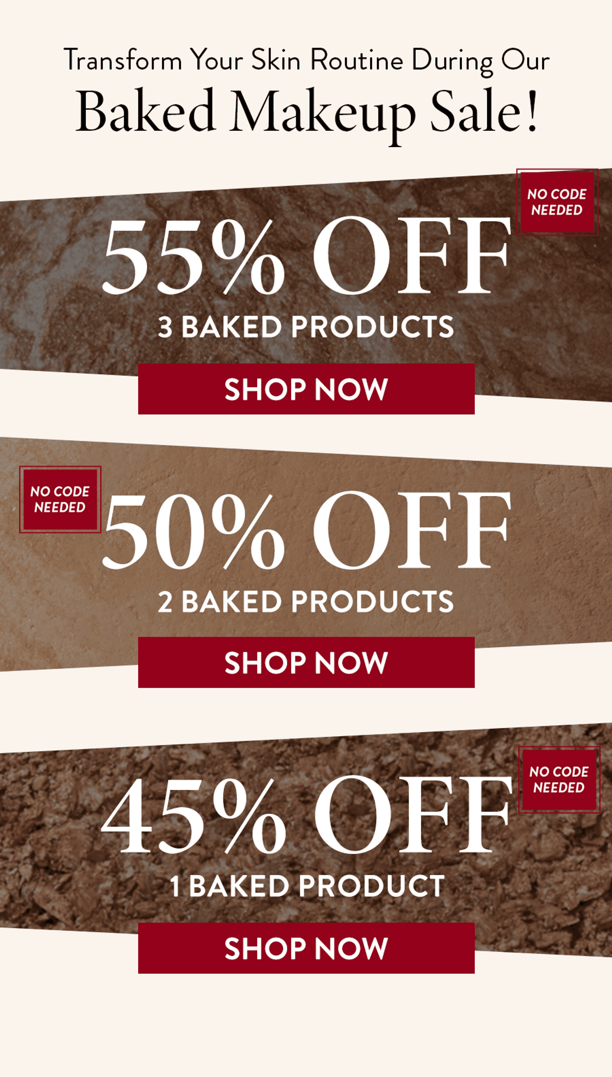 Laura Geller leverages email lists in Klaviyo to run and advertise its major promotions, including their recent sale on Baked Make-up, which discounted these products by 45% for one unit, 50% for two units and 55% for three or more units.