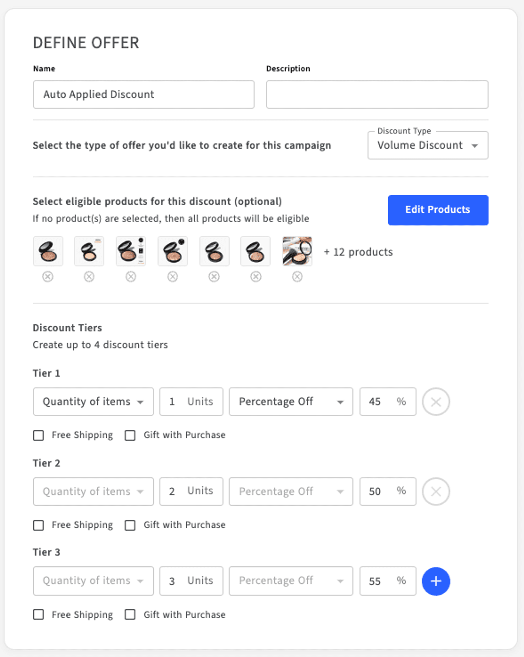 Flexibility in creating offers, including ability to apply the discount only to certain products and create progressive discount tiers based on cart value or number of units purchased.