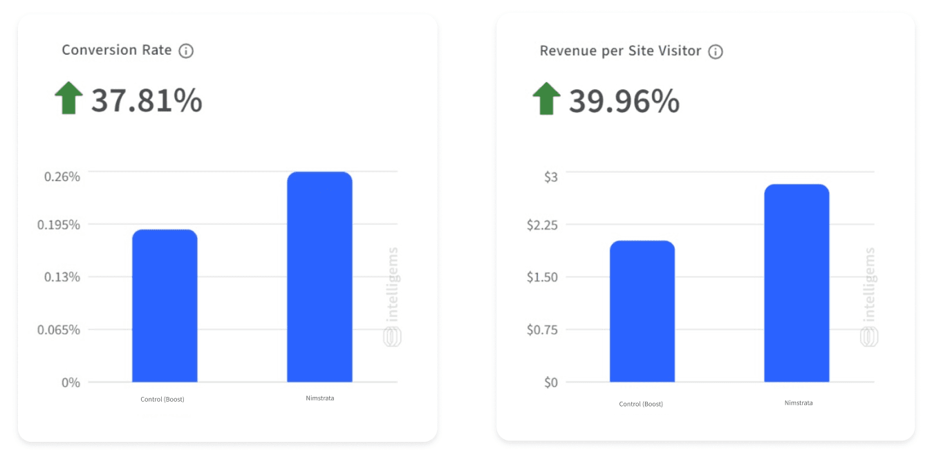 LOZURI used Intelligems to test Nimstrata's Search & Discovery Shopify app to measure the uplift of Google Cloud's Vertex AI on their catalog, resulting in a 38% increase in conversions.